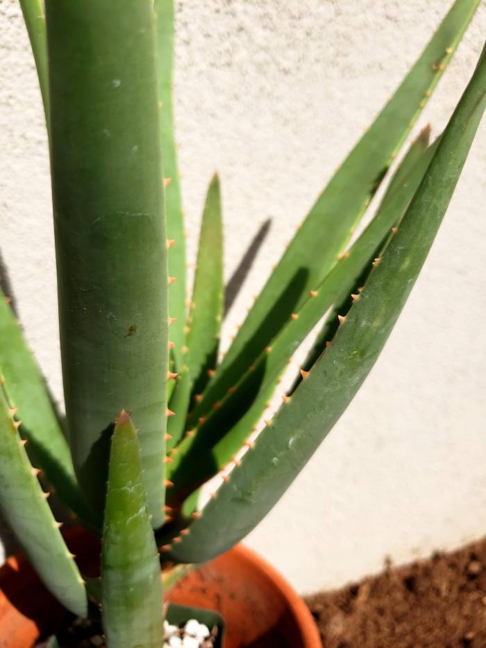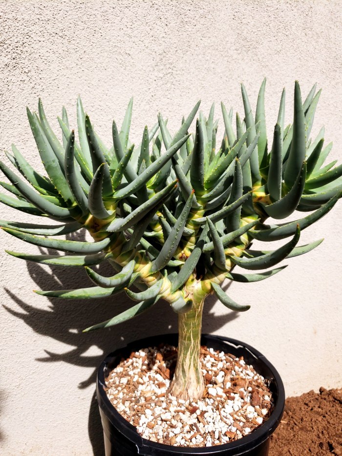 tree aloe, blue green leaves, teeth on margin, trunk becomes swollen at the base and striations appear